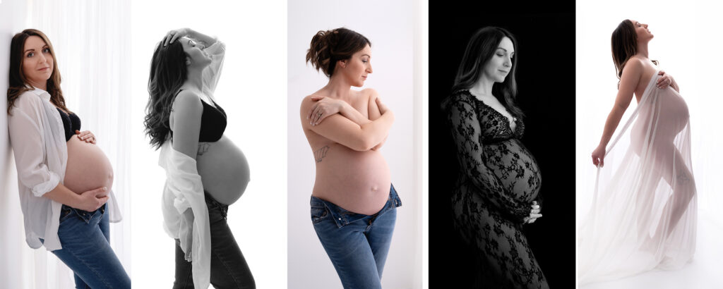 While you are welcome to bring personal items, most clients prefer to use my curated studio wardrobe of dresses, bodysuits and sheer materials to achieve my signature minimalist look. Though we do encourage clients to bring their pre-pregnancy jeans so we can include a casual “Calvin Klein-esque” set that’s easy to share with anyone!